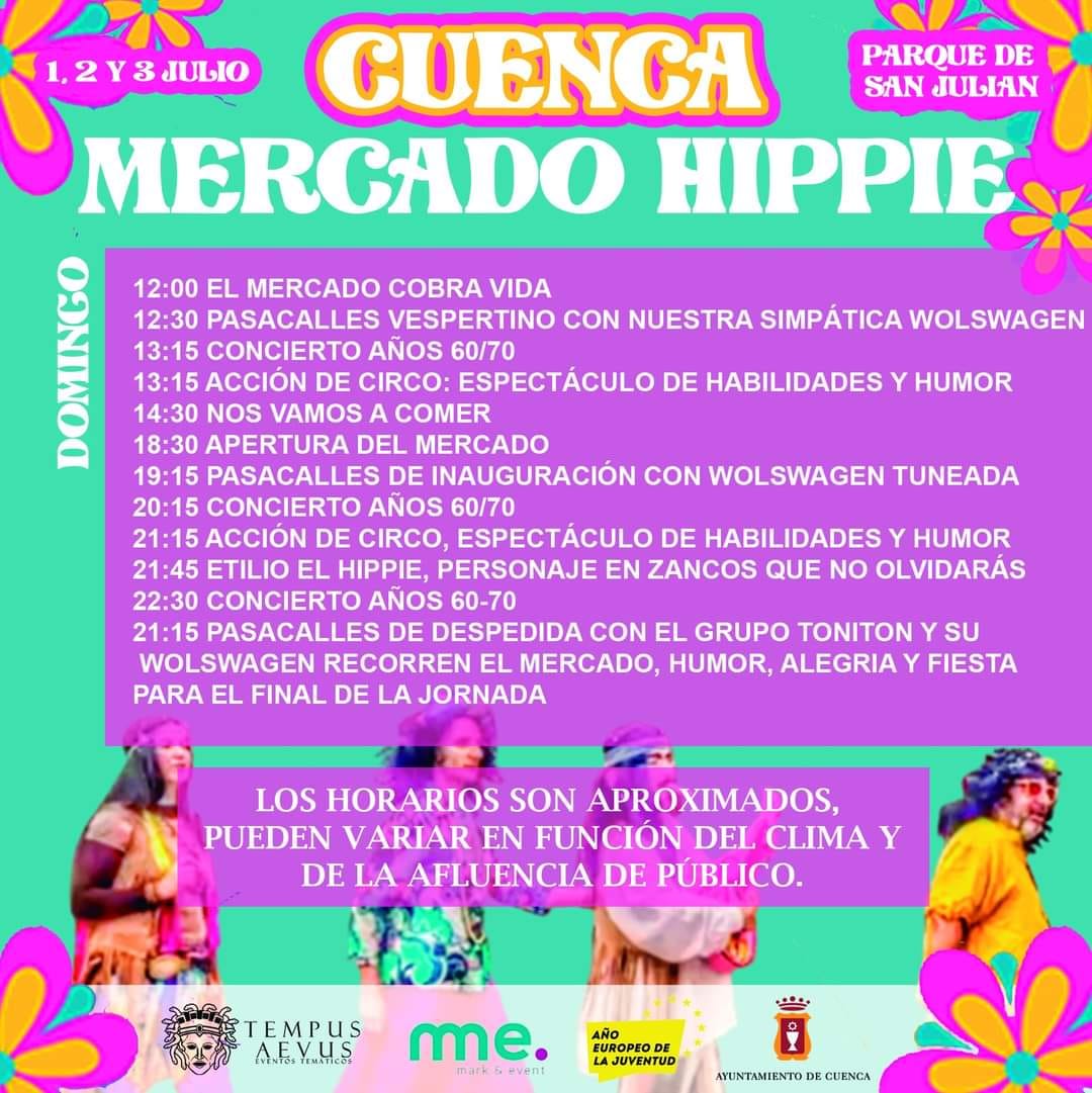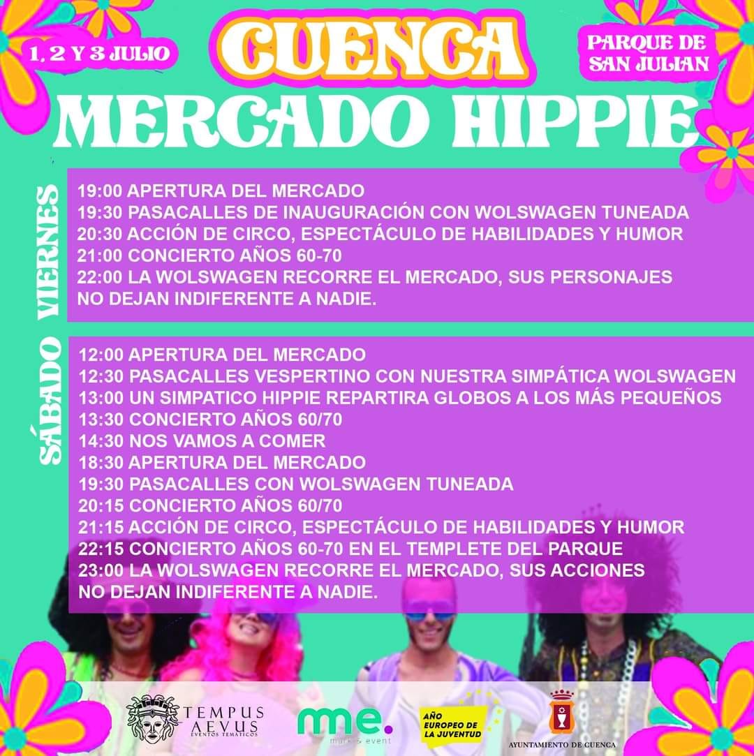 En el Mercado Hippie se podrán adquirir una gran variedad de artículos con puntos de venta de artesanía, moda, antigüedades, artículos de decoración relacionados con los años 60 y 70 y el movimiento hippie. Esta actividad contará, además, con animaciones, música y talleres de temática ‘hippie’.