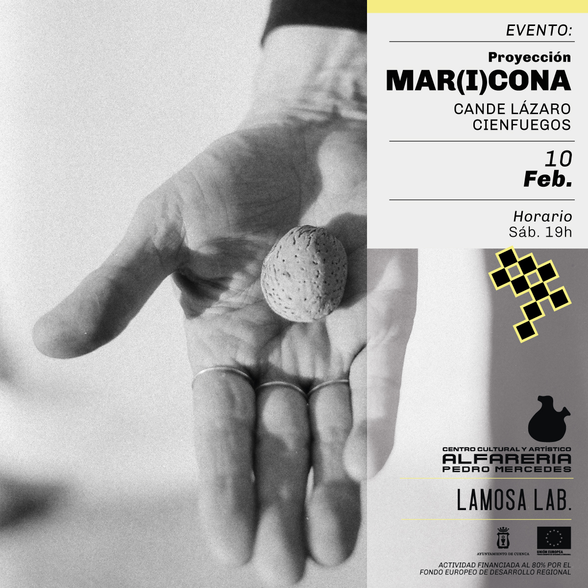Titulo CENTRO CULTURAL Y ARTÍSTICO PEDRO MERCEDES 19 horas Viernes, 10 Febrero 2023 PROYECCIÓN MAR(I)CONA Proyección de Cande Lázaro Cienfuegos el 10 de Febrero a las 19 horas Este vídeo es una reivindicación de la España vaciada, que no vacía, en la que también viven personas queer que existen y resisten.